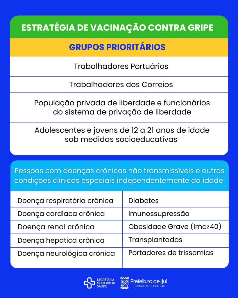 A Prefeitura Municipal, por meio da Secretaria da Saúde, informa que a vacinação contra a Influenza (gripe) terá início no dia 7 de abril e será destinada aos grupos prioritários, conforme as diretrizes do Ministério da Saúde.