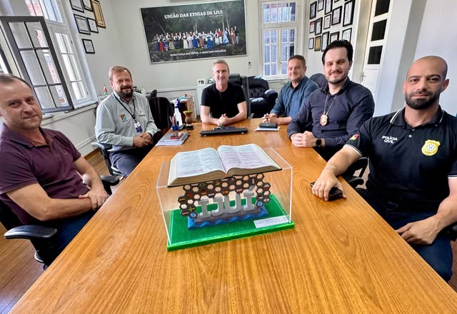 Prefeito Andrei Cossetin, acompanhado pelo secretário da Smodutran Fábio Franzen, recebeu a visita do delegado regional da Polícia Civil, Ricardo Miron, delegado da Draco de Ijuí, Antônio Gilberto Matter Soares, do comissário da Polícia, Marcio Dill e do inspetor de Polícia Mohamad Hatem.
