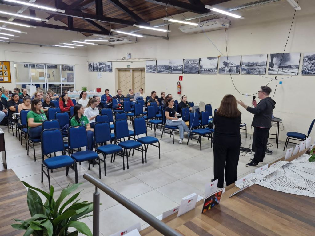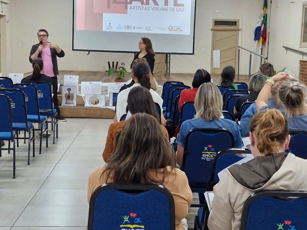 Nesta quarta-feira (07), foi realizada, na Estação Cultura Sady Strappazon, uma formação continuada para os professores de Arte dos Anos Iniciais e Finais do Ensino Fundamental da rede municipal de ensino de Ijuí. O encontro teve como objetivo apresentar e entregar o material didático do Projeto 14 Arte, além de promover uma reflexão sobre suas possibilidades pedagógicas no contexto escolar.