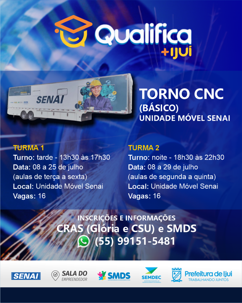 O Governo de Ijuí, por meio das Secretarias de Desenvolvimento Social e Econômico, Sala do Empreendedor, através do Programa Qualifica+ Ijuí e parceria com Senai, abrem as inscrições para o curso de Torno CNC Básico.