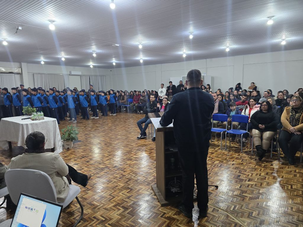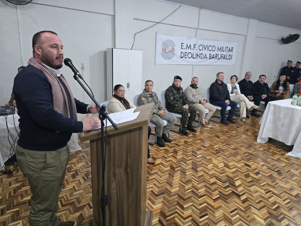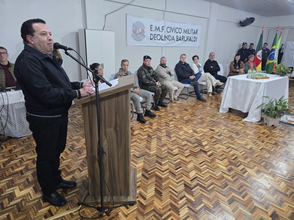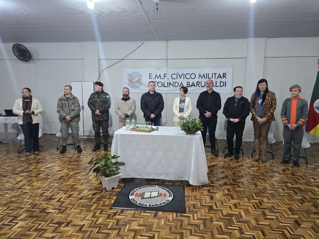 O Governo de Ijuí, por meio da Secretaria Municipal de Educação (SMED), oficializou, na noite desta quinta-feira (26), a instalação do Programa Municipal das Escolas Cívico-Militares na Escola Municipal Fundamental Deolinda Barufaldi, localizada no bairro Alvorada. A iniciativa tem base na Lei Municipal nº 7.544, de 18 de janeiro de 2024, que institui e regulamenta o modelo no âmbito da Rede Municipal de Ensino.