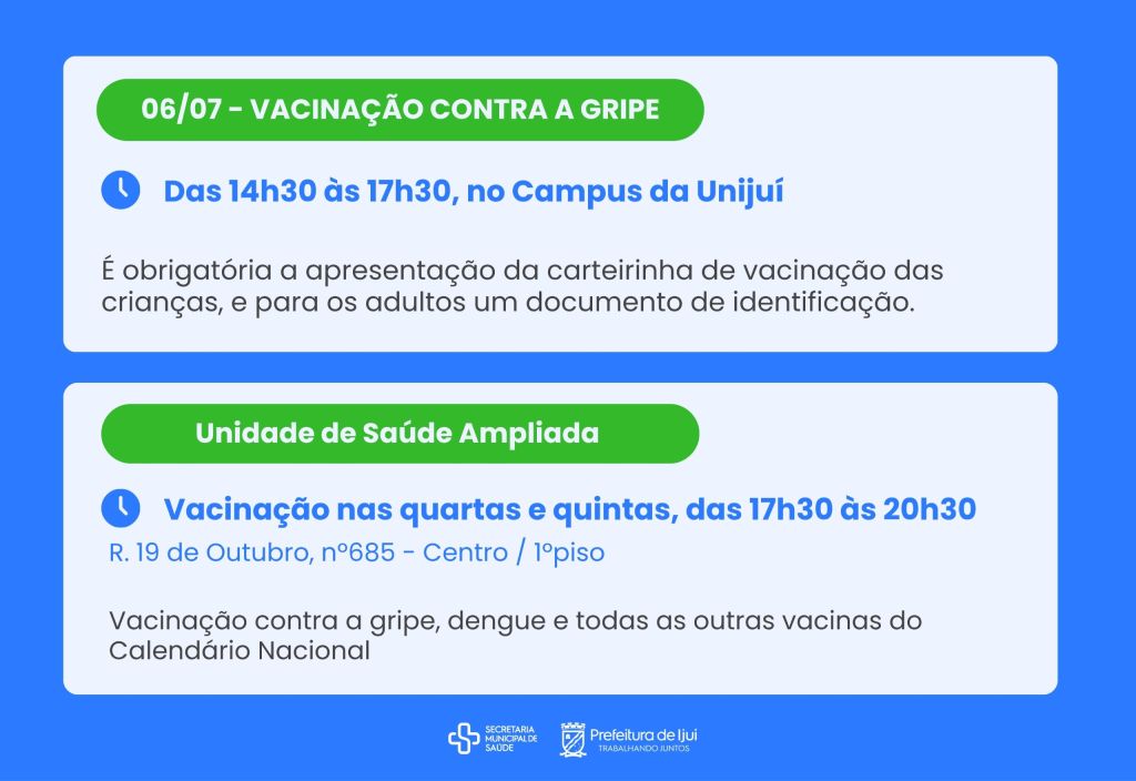 No domingo, dia 6 de julho, das 14h30 às 17h30, será realizada vacinação contra a gripe no campus da Unijuí, com os mesmos critérios de documentação exigidos: apresentação obrigatória da carteirinha de vacinação das crianças, enquanto os adultos devem apresentar um documento de identificação.