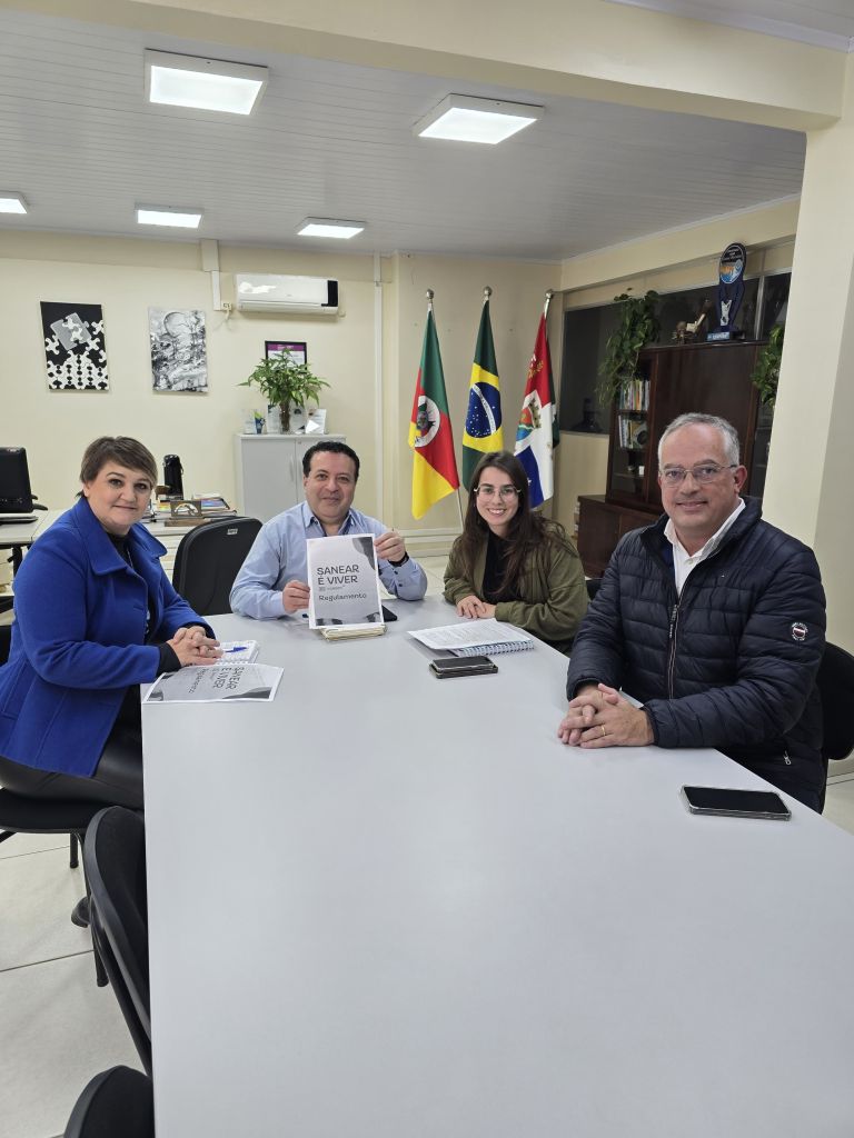 Na manhã desta terça-feira (08), o secretário de Educação, Cláudio de Souza, recebeu o gerente institucional da Corsan, Felipe Trindade, e a analista de Responsabilidade Social, Bibiany Costa, para apresentação do concurso do Programa Sanear é Viver, voltado aos professores de Geografia da rede municipal. A reunião também contou com a presença da coordenadora pedagógica da Secretaria Municipal de Educação (SMED), Denise Siekierski de Oliveira.