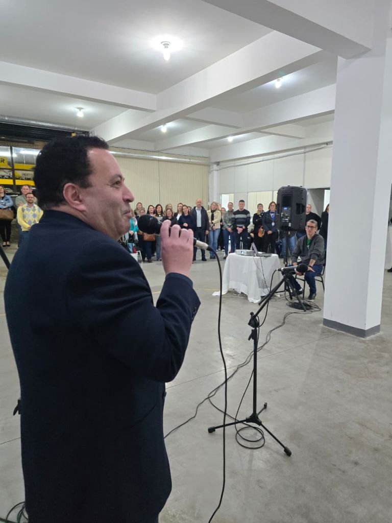 O vice-prefeito Marcos Barriquello parabenizou a equipe da SMED e fez um breve resgate histórico sobre a evolução da alimentação escolar no município. Ele ressaltou que as melhorias alcançadas são resultado do esforço conjunto de muitas pessoas e que o novo Cedae simboliza um avanço significativo nessa trajetória.