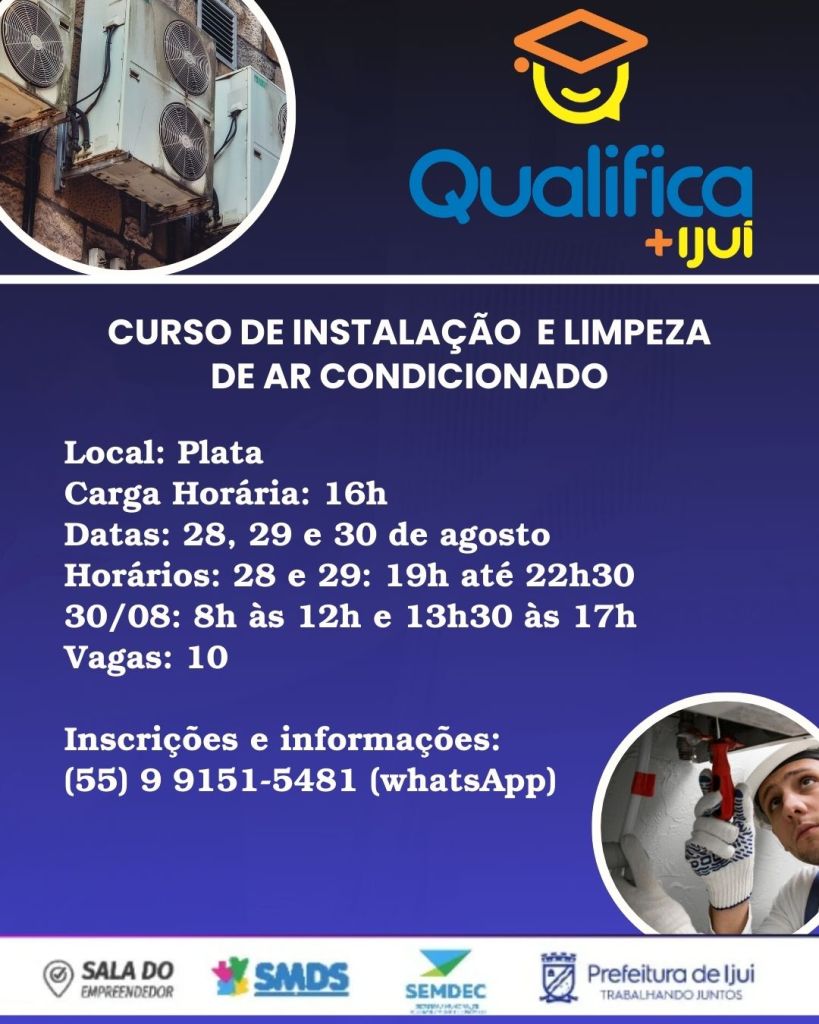 O Governo Municipal, por meio das secretarias de Desenvolvimento Econômico e Social, por meio do Programa Qualifica+Ijuí, abre 10 vagas para o curso de Instalação e Limpeza de Ar-condicionado.