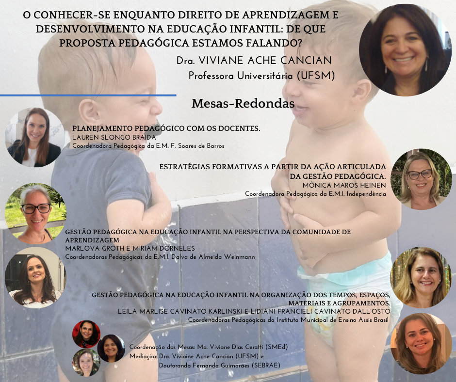A coordenação das mesas ficará sob responsabilidade da assessora pedagógica da Smed, Ma. Viviane Dias Ceratti, com mediação da Dra. Viviane Ache Cancian e da doutoranda Fernanda Guimarães.