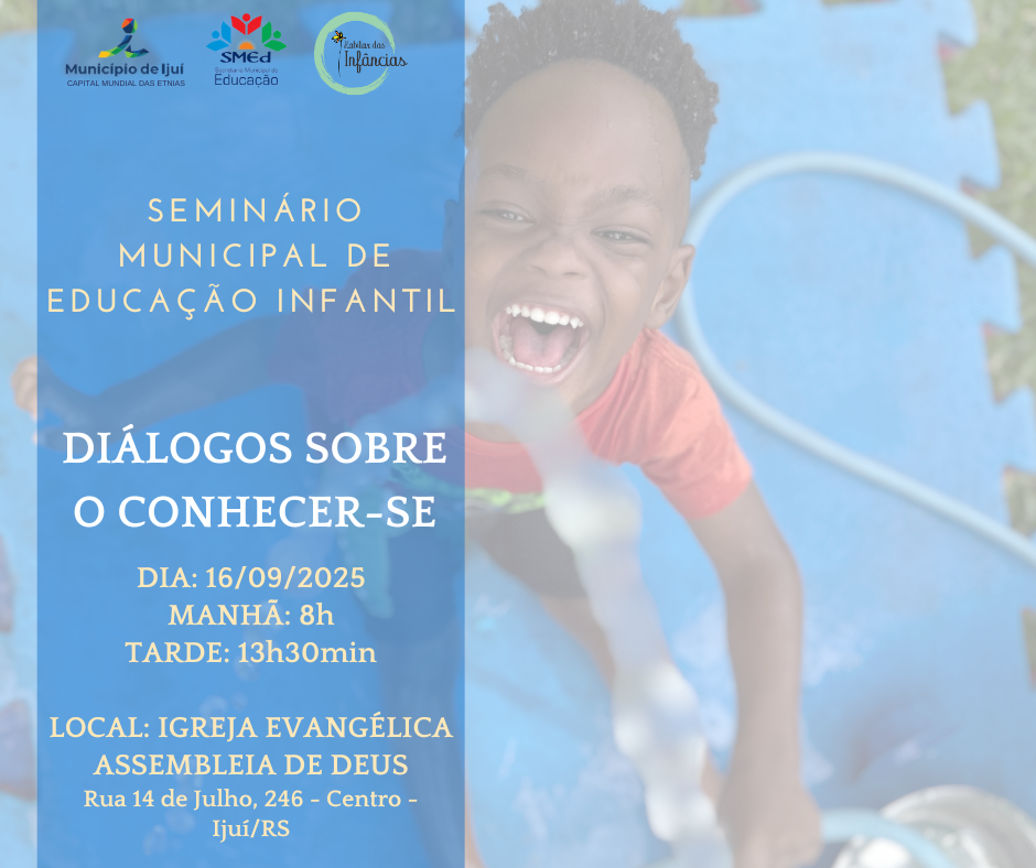 O Governo de Ijuí, por meio da Secretaria Municipal de Educação (Smed), promove nesta terça-feira (16), nos turnos da manhã e da tarde, na Igreja Evangélica Assembleia de Deus, mais uma edição do Seminário Municipal de Educação Infantil. O tema deste ano é “Diálogos sobre o conhecer-se”, com foco em práticas pedagógicas e no direito de aprendizagem e desenvolvimento das crianças.