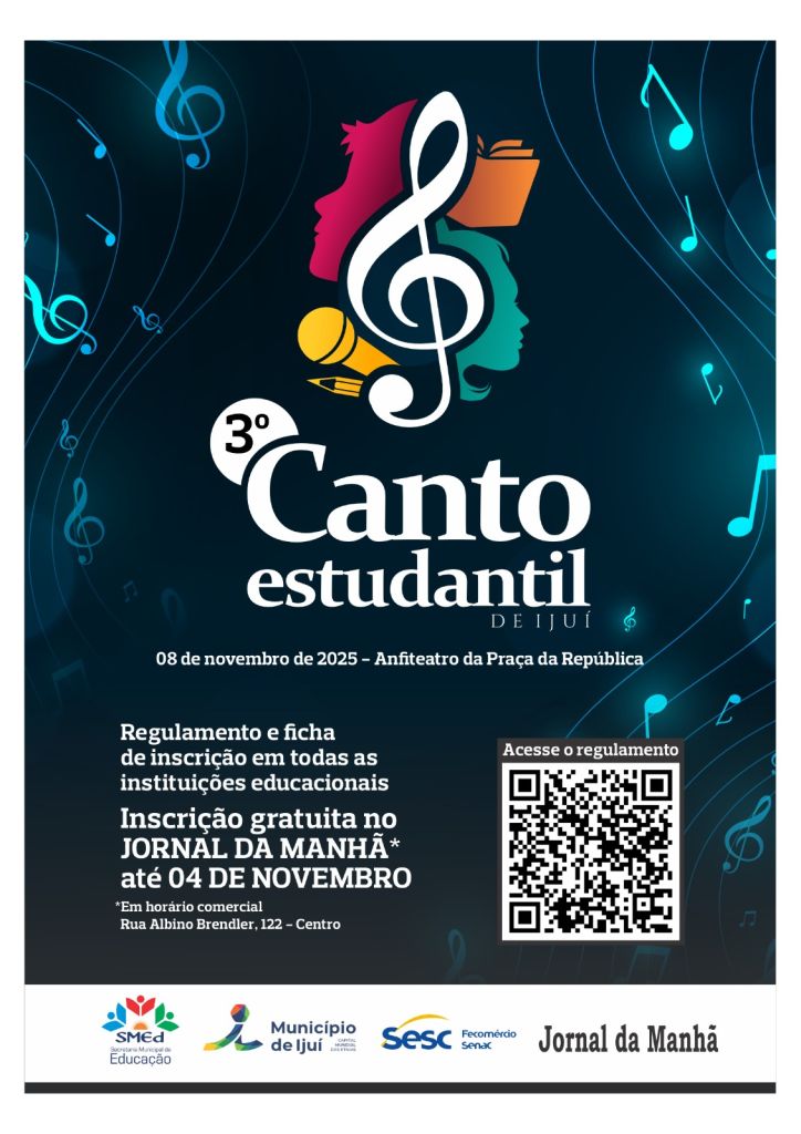 O III Canto Estudantil de Ijuí já tem data marcada. O festival musical voltado a estudantes das redes municipal, estadual, privada e do ensino superior será realizado no dia 8 de novembro de 2025, a partir das 14h, no Anfiteatro da Praça da República, integrando a programação da 32ª Feira do Livro de Ijuí e da 35ª Feira do Livro Infantil do Sesc.