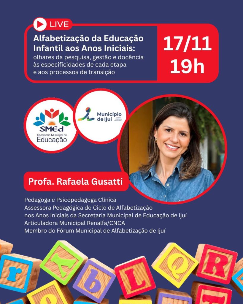 Com o tema “Alfabetização da Educação Infantil aos Anos Iniciais: olhares da pesquisa, gestão e docência às especificidades de cada etapa e aos processos de transição”, a live reunirá profissionais da educação para debater os desafios e estratégias que garantem a continuidade da alfabetização entre as etapas da Educação Infantil e do Ensino Fundamental.