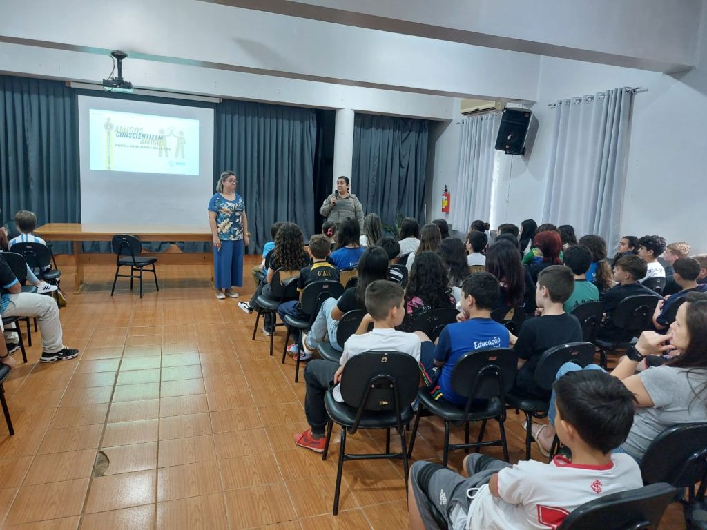 Com o tema “Amigos conscientizam amigos – Direitos e Deveres dentro e fora da escola”, a atividade abordou assuntos relacionados à convivência escolar, responsabilidade individual, segurança e fortalecimento de laços positivos entre os alunos. O objetivo foi contribuir para a construção de um ambiente escolar mais seguro, respeitoso e colaborativo.