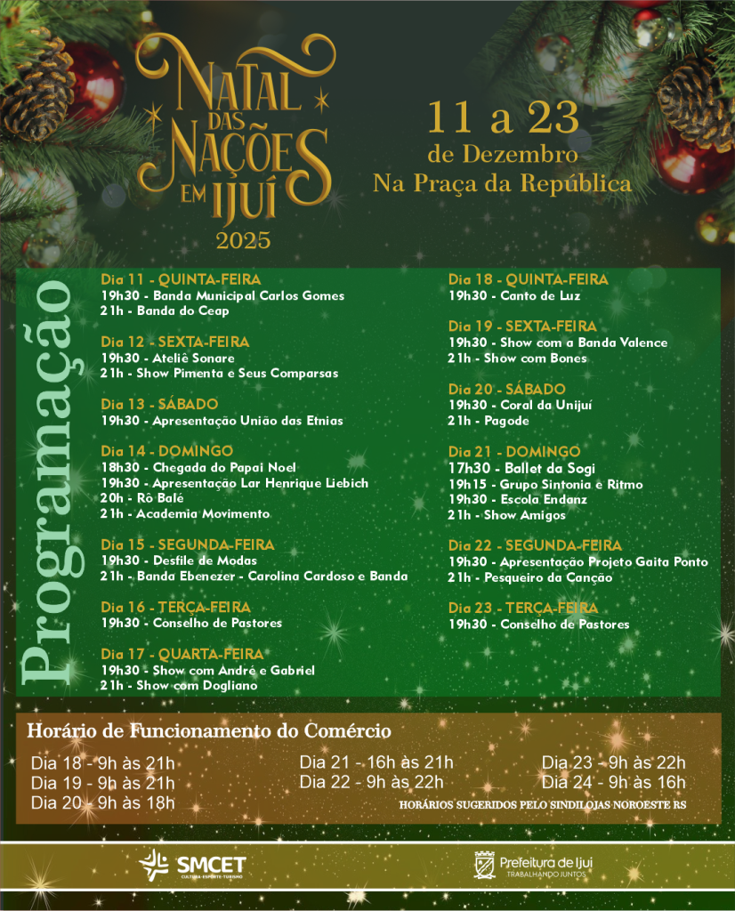 O Governo Municipal, por meio da Secretaria de Cultura, Esporte e Turismo, apresenta o Natal das Nações em Ijuí 2025.