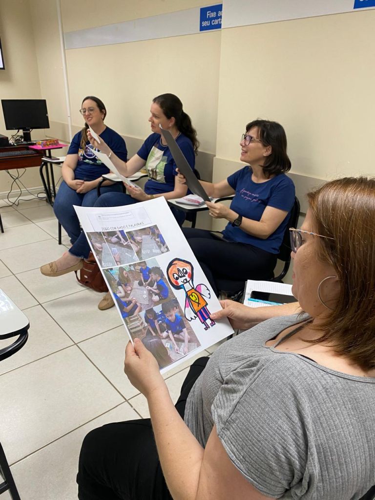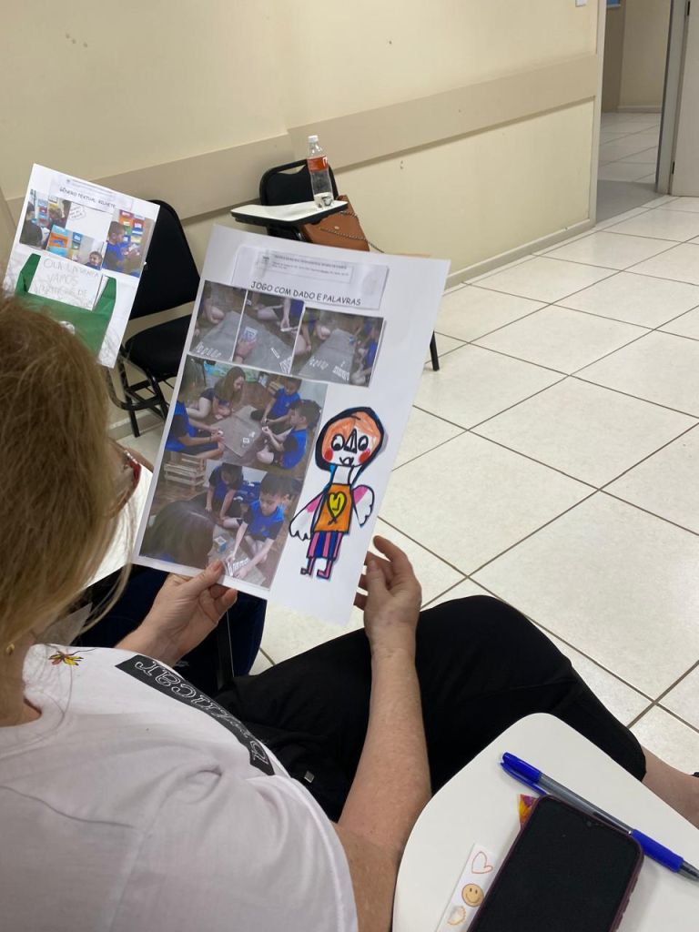 Durante o encontro, as docentes apresentaram práticas pedagógicas realizadas ao longo do ano, desenvolvidas a partir dos objetos de conhecimento previstos no Referencial Curricular Municipal para os anos iniciais do Ensino Fundamental.