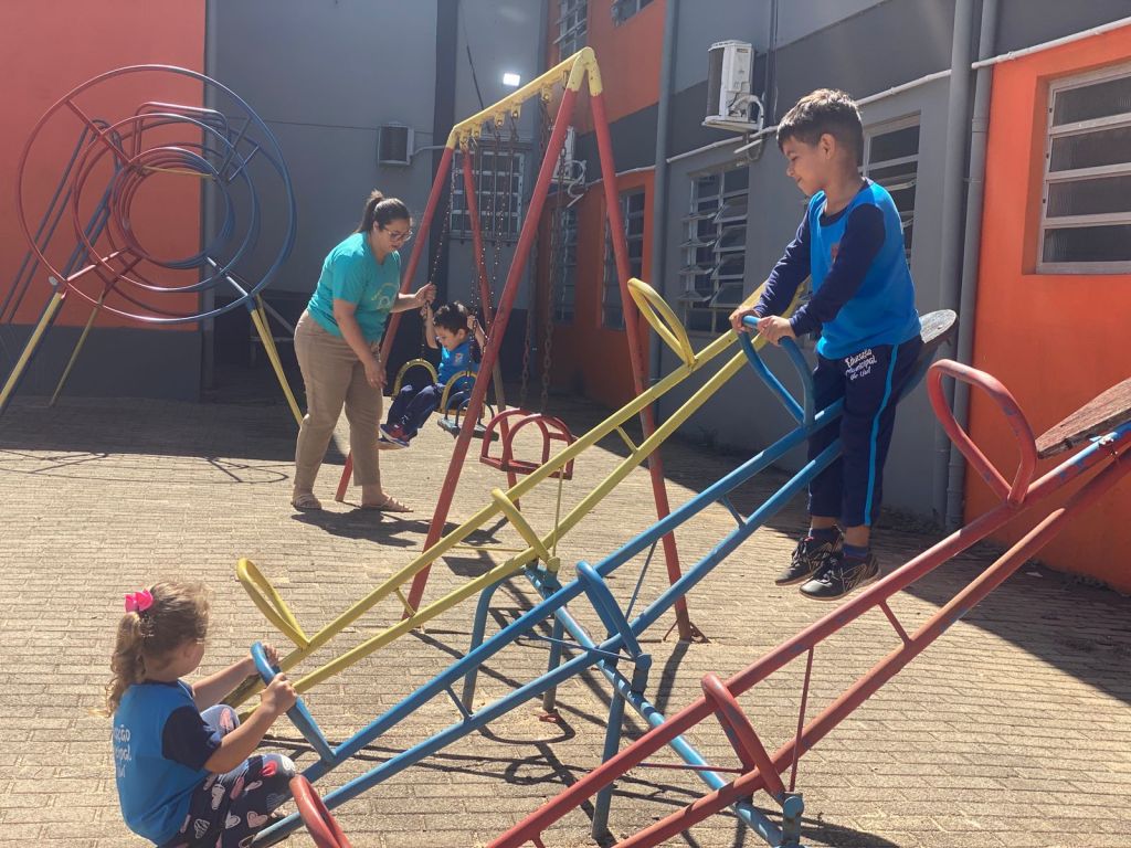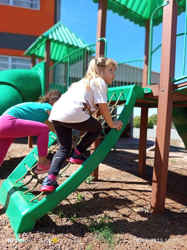 Durante a vivência, as crianças do Maternal II da EMI Alvorada visitaram a EMF Deolinda Barufaldi, escola para a qual grande parte das famílias realiza a matrícula na Pré-escola. No local, os estudantes tiveram a oportunidade de conhecer os espaços da escola, participar de momentos de brincadeira na sala de referência e no pátio, além de compartilhar um lanche, favorecendo a familiarização com a nova rotina.