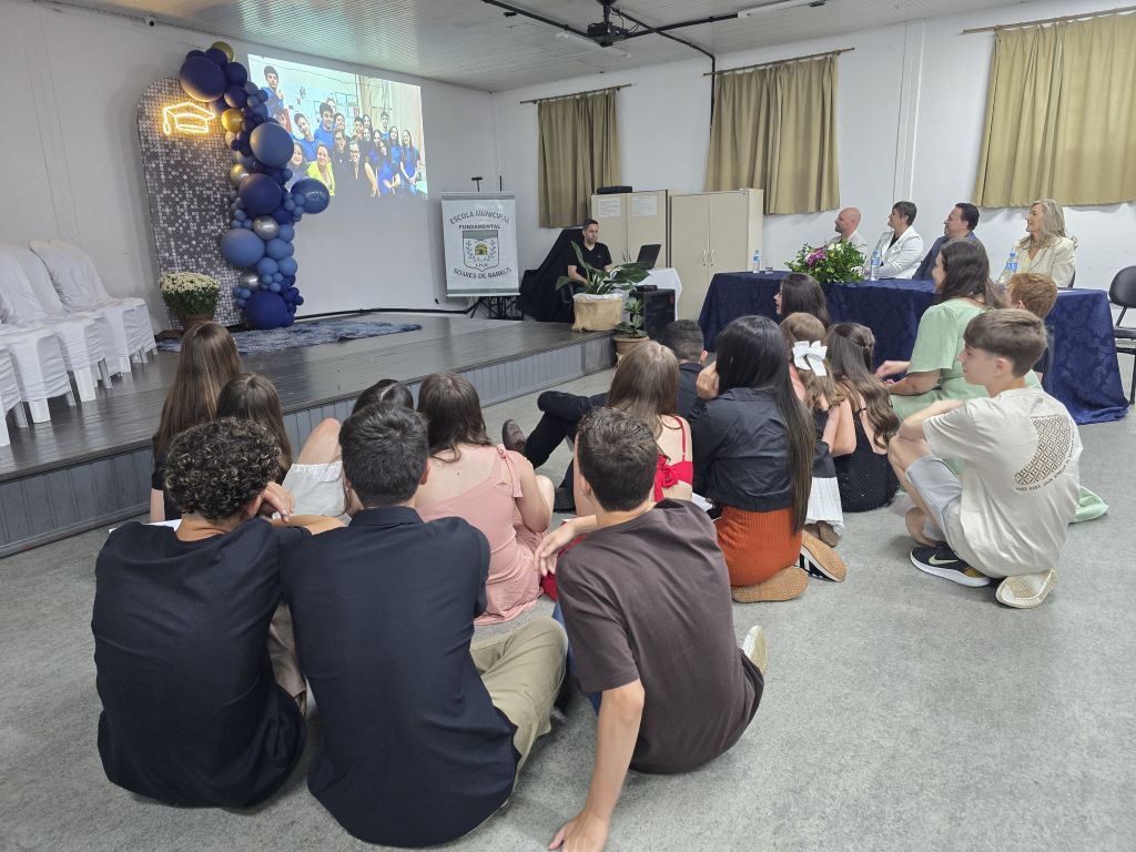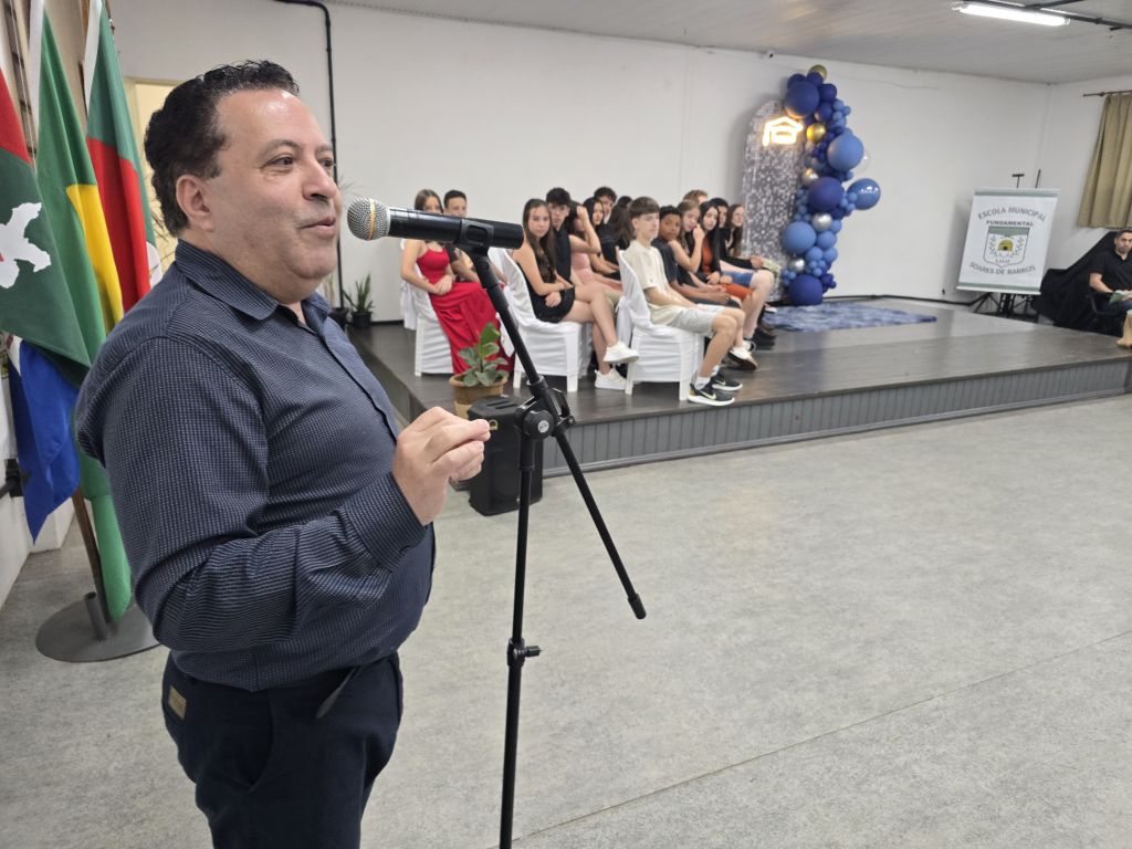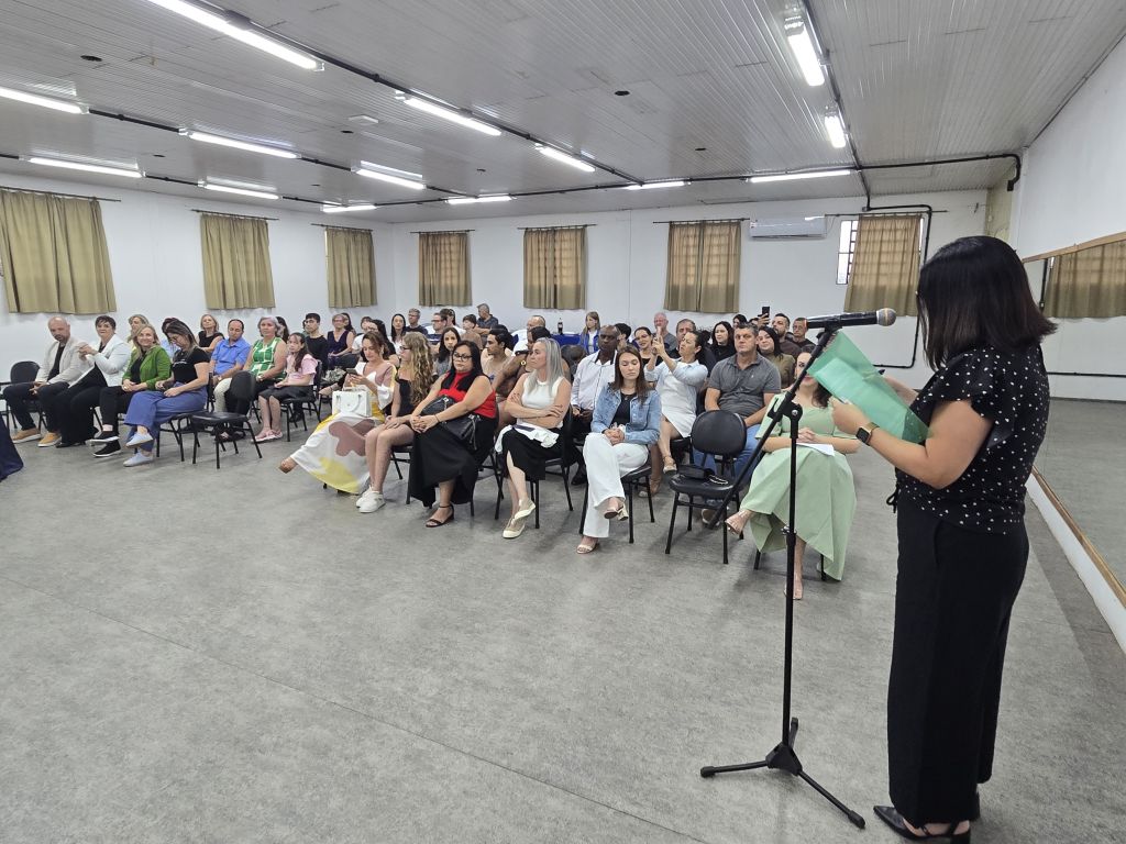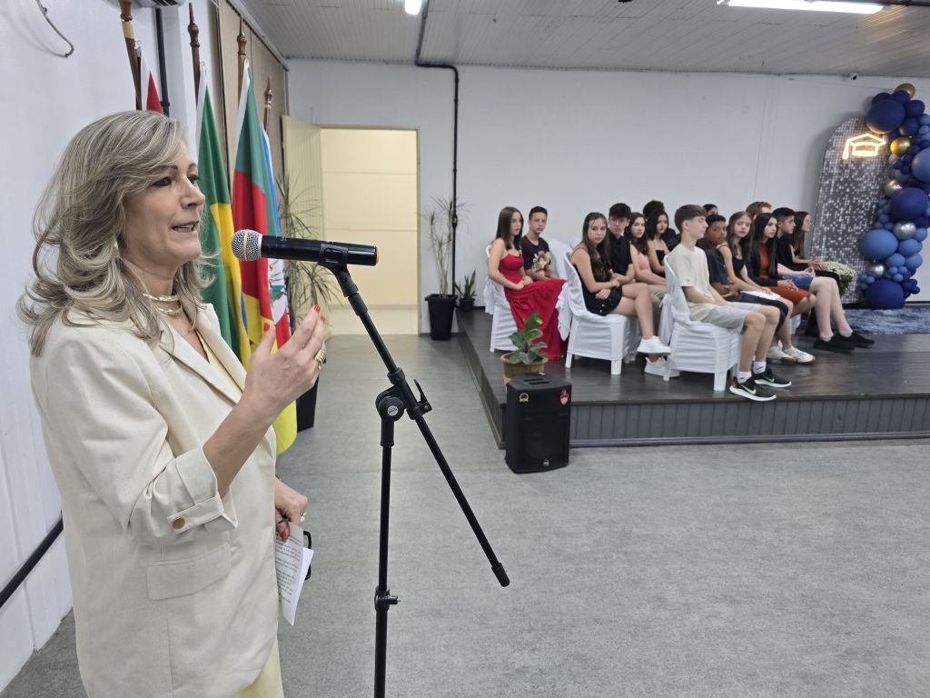 A diretora da EMF Soares de Barros, Rosa Mari Vieira Macuglia, também se manifestou, ressaltando os desafios enfrentados e as aprendizagens construídas pelos estudantes ao longo do programa. A solenidade contou ainda com a presença da coordenadora pedagógica da SMEd, Denise Siekierski, da secretária adjunta Andréia da Rosa, da chefe de gabinete Rosangela Schimanoski, da professora facilitadora do projeto, além de pais e responsáveis.