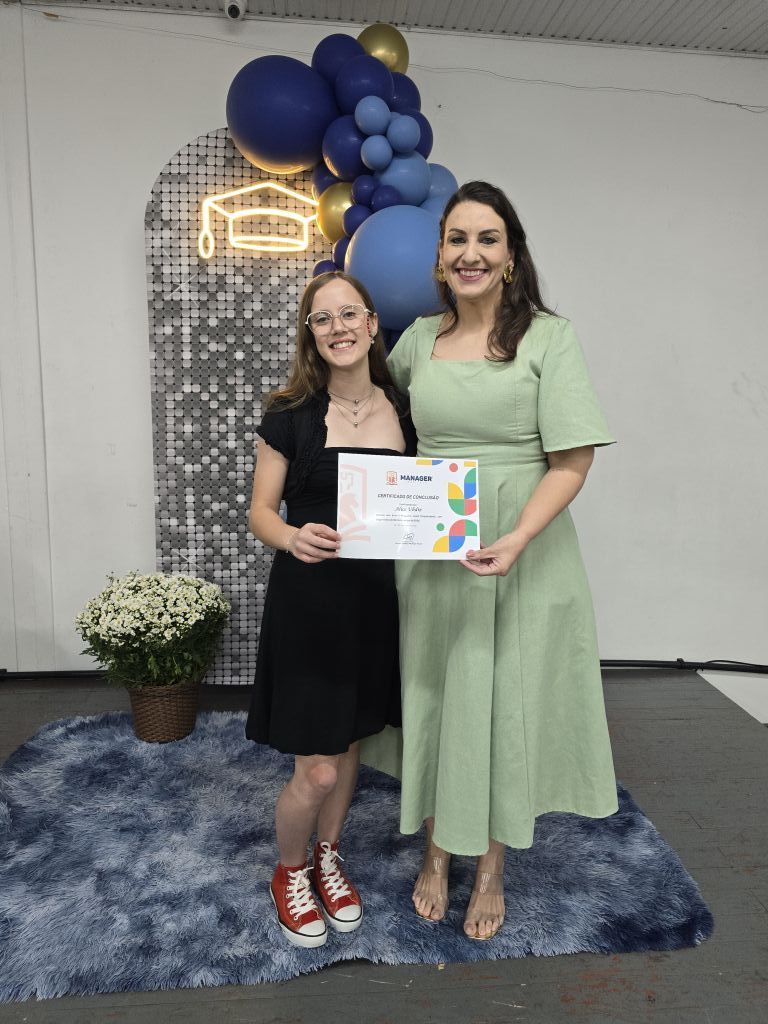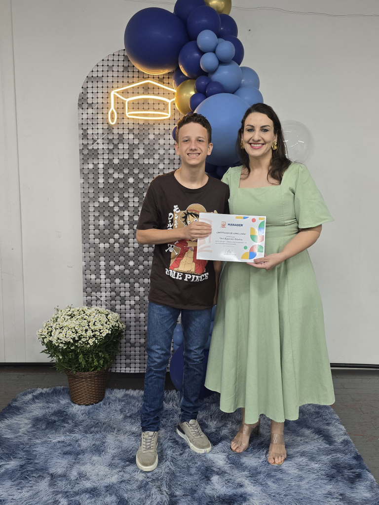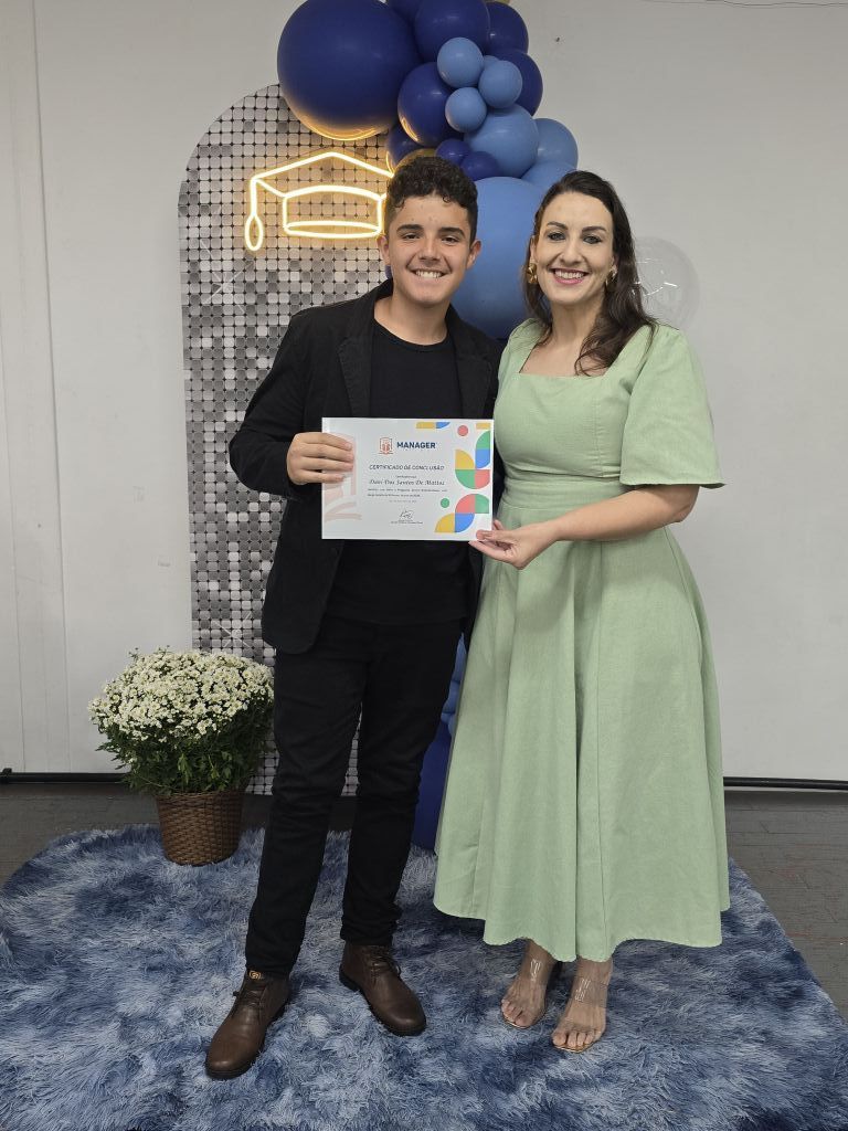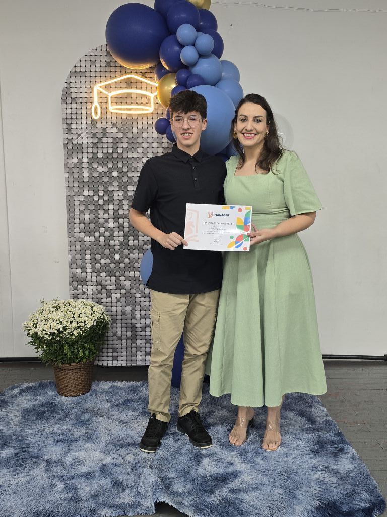 O diretor do Instituto Manager, Anderson Detogni, parabenizou a professora facilitadora Fabiana Bohrer pela condução do projeto e destacou o desempenho da turma, que participou da formação por quatro meses e conquistou o primeiro lugar entre mais de seis mil estudantes participantes em todo o estado.