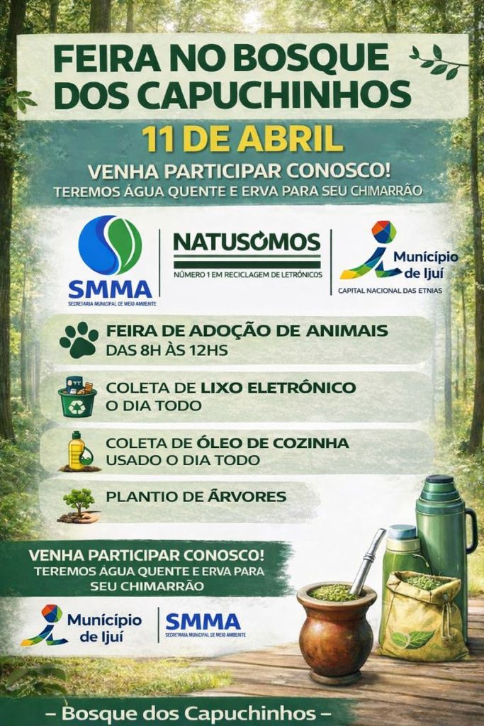 O Bosque dos Capuchinhos, localizado no bairro São Geraldo, será palco de uma programação especial voltada ao meio ambiente e ao bem-estar animal no próximo sábado, dia 11 de abril. O evento, promovido pela Prefeitura de Ijuí por meio da Secretaria de Meio Ambiente, em parceria com a Natusomos, convida toda a comunidade a participar de um dia dedicado à sustentabilidade e à solidariedade.