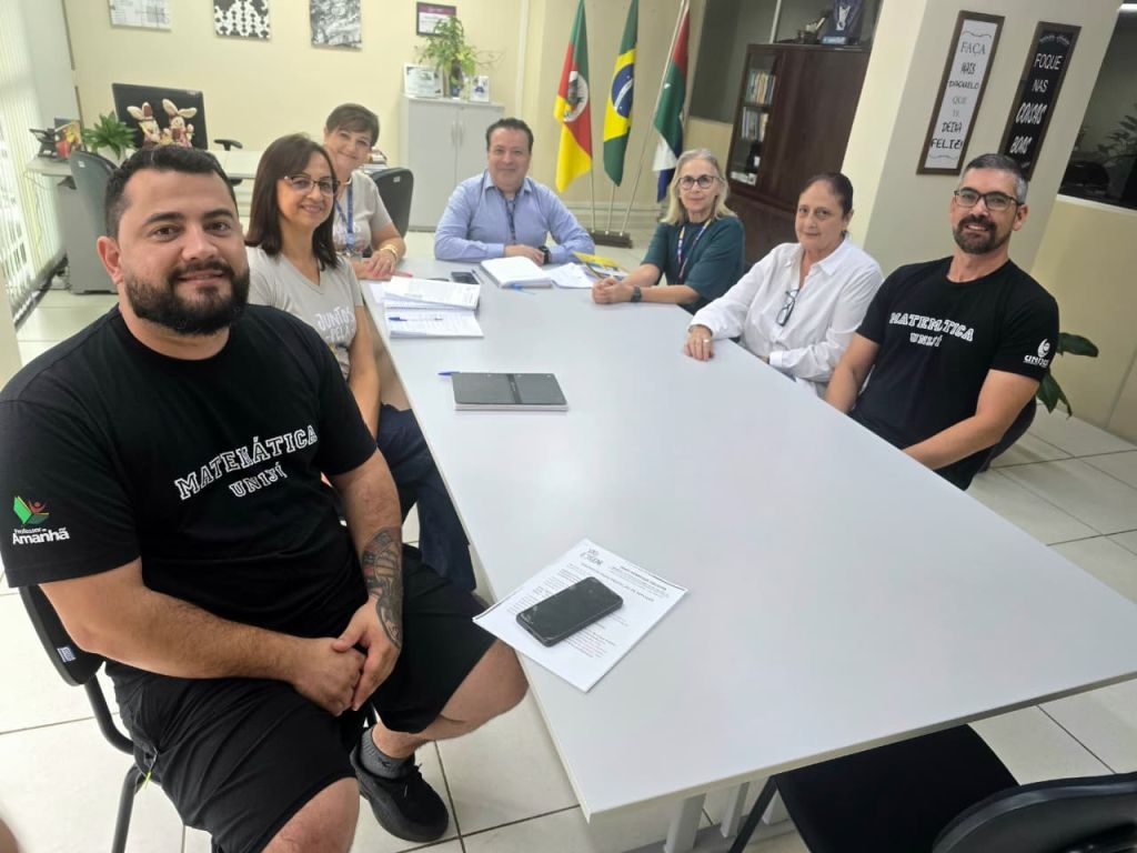 Participaram do encontro o secretário de Educação, Cláudio de Souza, a coordenadora pedagógica geral, Denise Siekierski de Oliveira, a coordenadora do programa Professor do Amanhã da Unijuí, Cátia Nehring, a coordenadora do curso de Licenciatura em Matemática da Unijuí, Patrícia Spilimbergo, o vice-presidente do Centro Acadêmico de Matemática, Samuel Rocha, e o integrante do Centro Acadêmico, Fernando Dellafavera.