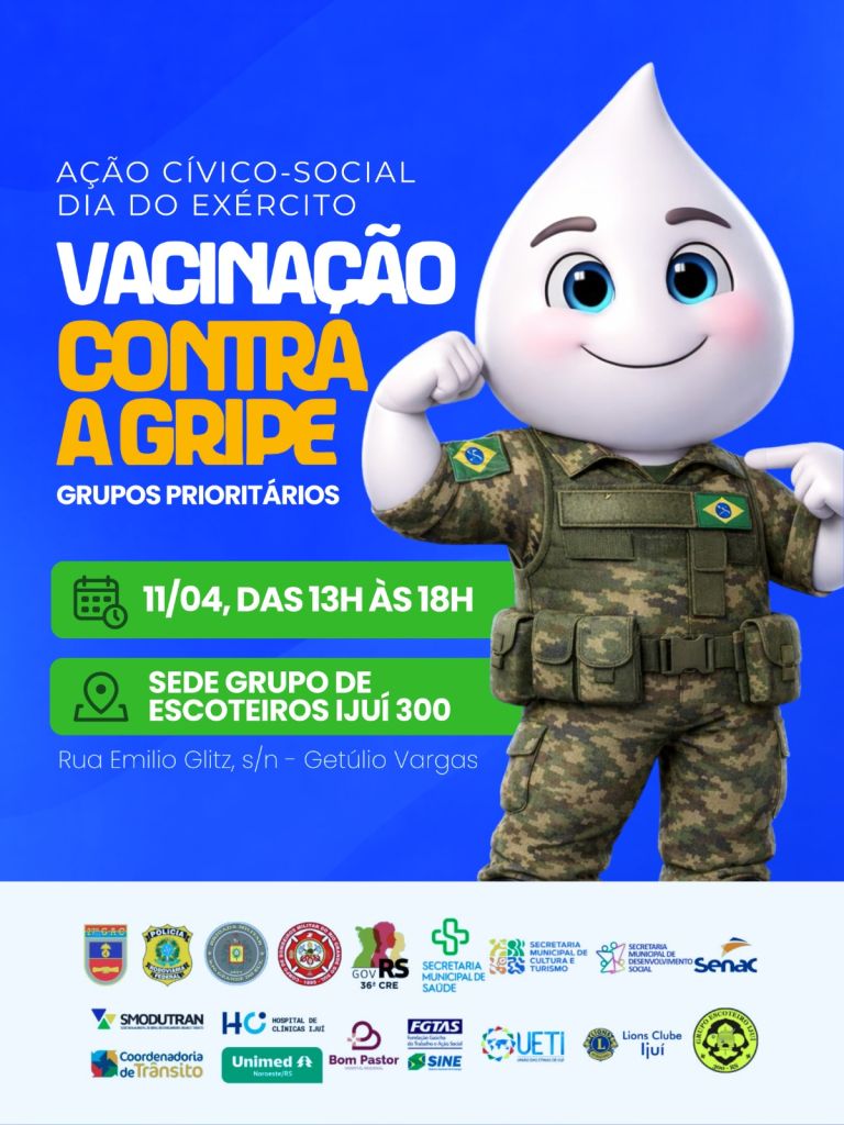 Neste sábado,11 de abril, a Prefeitura de Ijuí irá realizar a vacinação contra a gripe para os grupos prioritários na Ação Cívico-Social em alusão ao Dia do Exército, promovida pelo 27º Grupo de Artilharia de Campanha (27º GAC), Brigada Militar, Polícia Rodoviária Federal e Corpo de Bombeiros de Ijuí.
