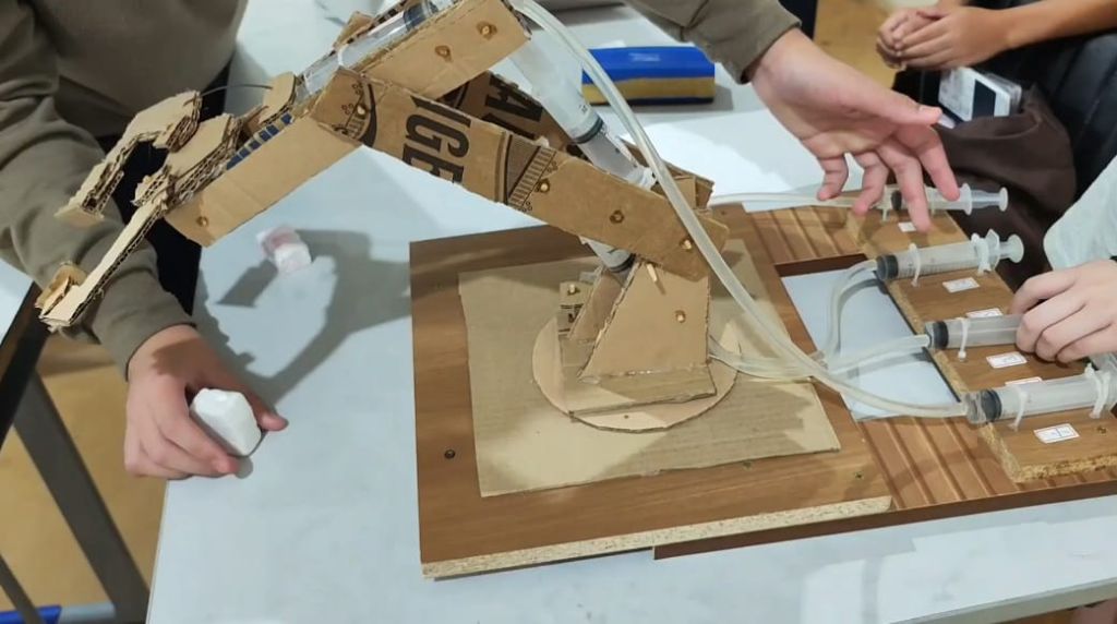 Como proposta prática, um grupo de cinco alunos construiu uma garra hidráulica utilizando materiais como papelão, cola quente, palitos, seringas e base de madeira. A produção foi realizada tanto em sala de aula quanto em casa, integrando diferentes momentos de aprendizagem.