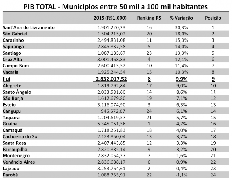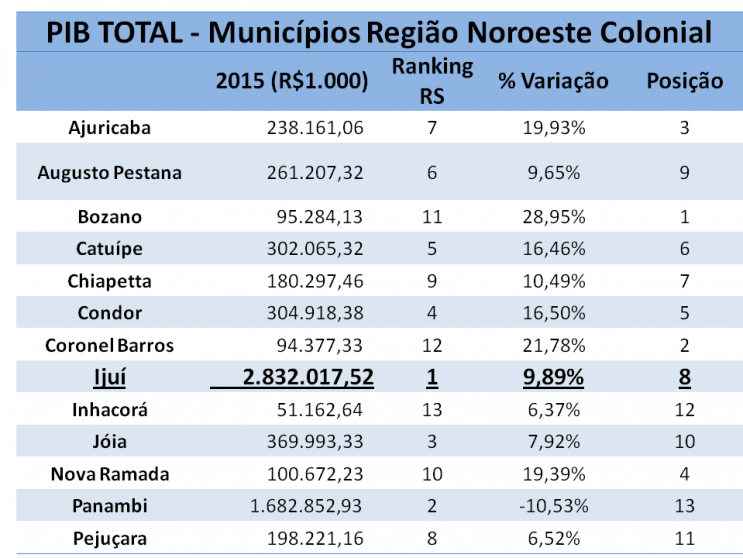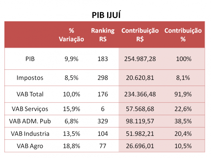 O município de Ijuí ocupa a 27ª colocação no ranking de retorno do ICMS entre os 497 municípios que abrangem o Estado do Rio Grande do Sul. Dado divulgado em 22 de outubro de 2018, ano base 2017 (Secretaria da Fazenda - Receita Estadual - Sistema de Apuração dos Índices dos Municípios e Núcleo de ICMS do Município de Ijuí).