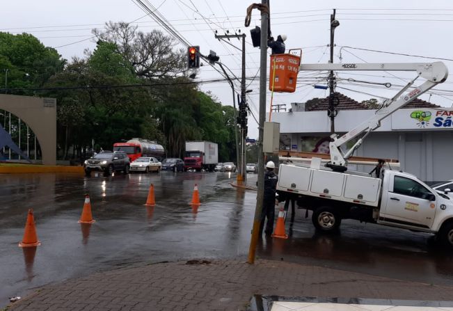 Os postes de uma semáforo e de uma placa de trânsito foram derrubados por um caminhão no final de semana, na esquina da Praça dos Imigrantes em Ijuí. O Demei e o município providenciaram o conserto das estruturas danificadas, porém, será o caminheiro que vai arcar com os danos causados ao patrimônio público. O motorista foi identificado e foi registrado boletim de ocorrência na Delegacia de Polícia. As estruturas caíram após o caminhão enroscar e puxar a fiação naquele local.
