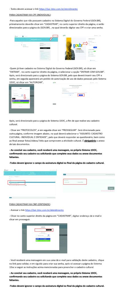 A Secretaria Municipal de Cultura, Esporte e Turismo (SMCET) fará o cadastramento de pessoas que de alguma forma atuam culturalmente no município. O objetivo além de conhecer o que é feito e por quem, é poder desenvolver políticas públicas para o setor, com apoio do Conselho Municipal de Cultura (Comuci). O secretário da pasta, Noel Torquato, ressalta que devem se cadastrar todas aquelas pessoas que fazem desde trabalhos manuais até músicos, artistas, dançarinos, etc. “A ideia é conhecer as pessoas que têm alguma produção cultural no sentido amplo do conceito de cultura, envolvendo os cidadãos que moram nos bairros e também no interior de Ijuí”, explica Torquato. O cadastramento começará a partir de hoje, sexta-feira (23/09/2022), através do link https://ijui.1doc.com.br/atendimento. Em caso de dúvidas, podem entrar em contato pelo telefone 3331-8200 (Ramal 320), ou ainda de forma presencial na Secretaria Municipal de Cultura, Esporte e Turismo (SMCET), na Rua XV de Novembro, nº 593, 4º andar das 08h30min às 11h30min, e das 13h30min às 17h, de segunda a sexta-feira.