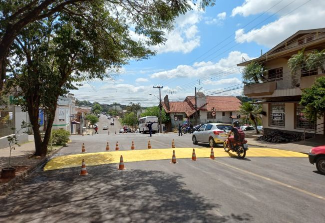 Foi instalada nesta segunda-feira, 26, uma nova lombada na rua Bento Gonçalves. A estrutura foi implementada acerca de 20 metros do cruzamento com a rua Álvaro Chaves. A obra foi necessária para reduzir a velocidade dos veículos que trafegam pela Bento Gonçalves neste trecho, que teve aumento após a retirada da estrutura da rotatória que existia naquele local.