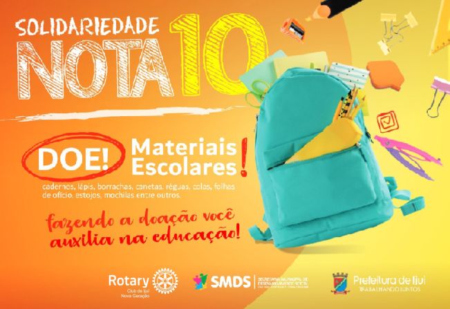 A SMDS através dos CRAS, juntamente com parceiros e apoiadores da Campanha Solidariedade Nota 10, estará realizando uma ação no sábado, 4, a partir das 9h na Praça da República para arrecadação de materiais escolares. Venha fazer parte desta ação e faça a sua doação.