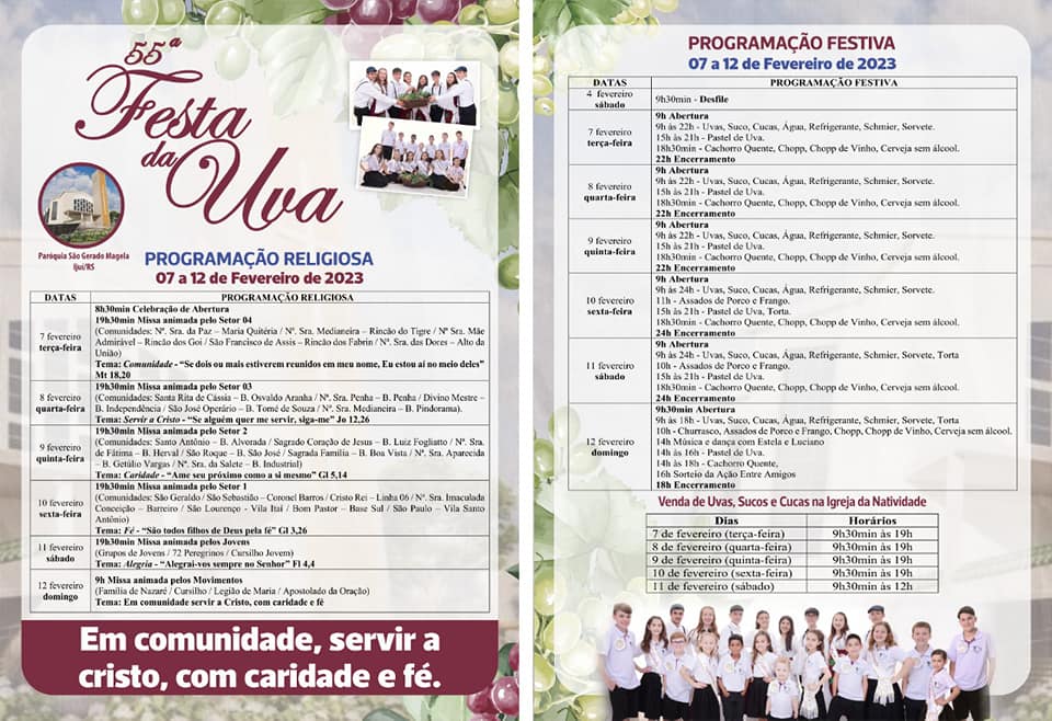 O prefeito Andrei Cossetin recebeu hoje em seu gabinete a comitiva da 55ª Festa da Uva da Paróquia São Geraldo de Ijuí. A tradicional festa ocorre entre os dias 7 e 12 de fevereiro com uma ampla e variada programação Durante os festejos haverá a venda de produtos a base de uva, como cucas, sucos, vinhos, pastel de uva e também de outros produtos que já são tradicionais da festa, como o cachorro quente, assados e bebidas.