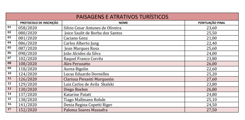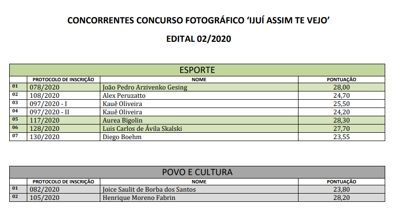 Inscrições: 078/2020 - João Pedro Arzivenko Gesing; 117/2020 - Aurea Bigolin;