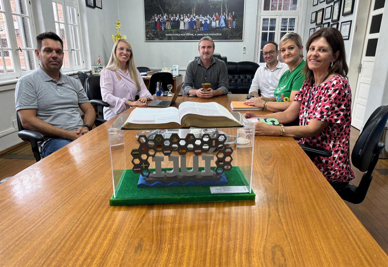 Prefeito Andrei Cossetin Sczmanski, acompanhado pelo secretário de saúde Márcio Strassburger, a coordenadora pedagógica da Secretaria de Educação, Denise Siekierski de Oliveira e a assessora pedagógica Cheila Viecili, recebeu a fonoaudióloga Caroline Peres e, Lorenzo Cunegato.