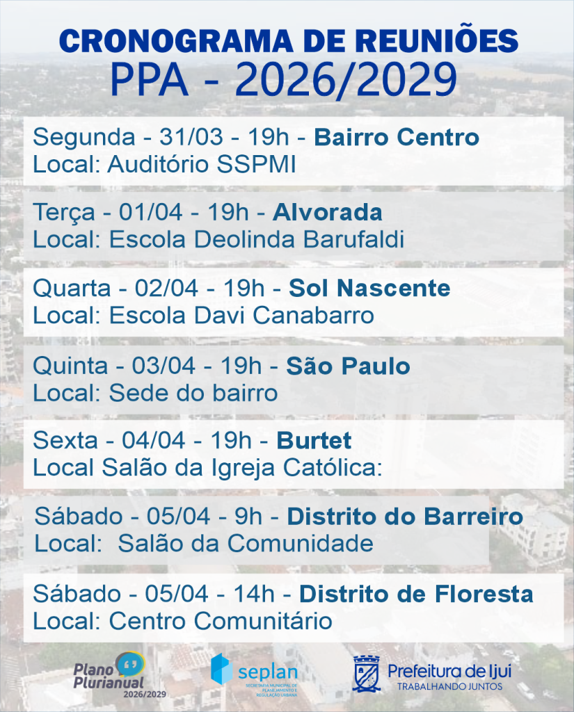O Governo Municipal, por meio da Secretária de Planejamento - Seplan, inicia na próxima semana, dia 31, as reuniões nos bairros e distritos referentes ao PPA 2026/2029.
