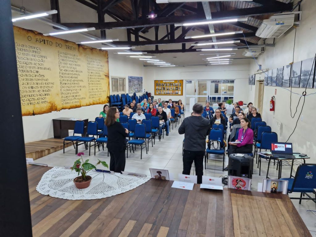 Nesta quarta-feira (07), foi realizada, na Estação Cultura Sady Strappazon, uma formação continuada para os professores de Arte dos Anos Iniciais e Finais do Ensino Fundamental da rede municipal de ensino de Ijuí. O encontro teve como objetivo apresentar e entregar o material didático do Projeto 14 Arte, além de promover uma reflexão sobre suas possibilidades pedagógicas no contexto escolar.