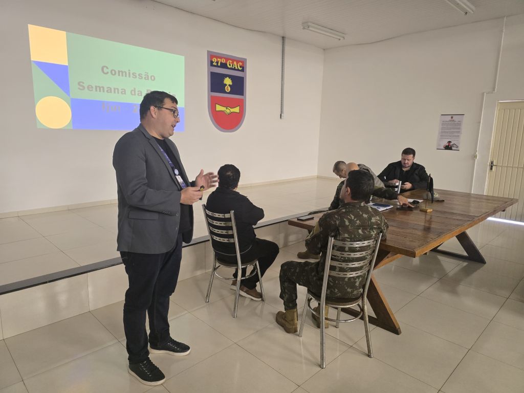 Durante a reunião, Fiorin resgatou o histórico dos selos comemorativos e temas das edições anteriores e apresentou a temática de 2025, que homenageará os profissionais e instituições da área da saúde, sob o lema: “Pátria saudável, povo forte”. A construção da identidade visual do evento foi detalhada pelo 1º Sargento André Luis Amorim da Rosa, chefe da Comunicação Social do 27º GAC.