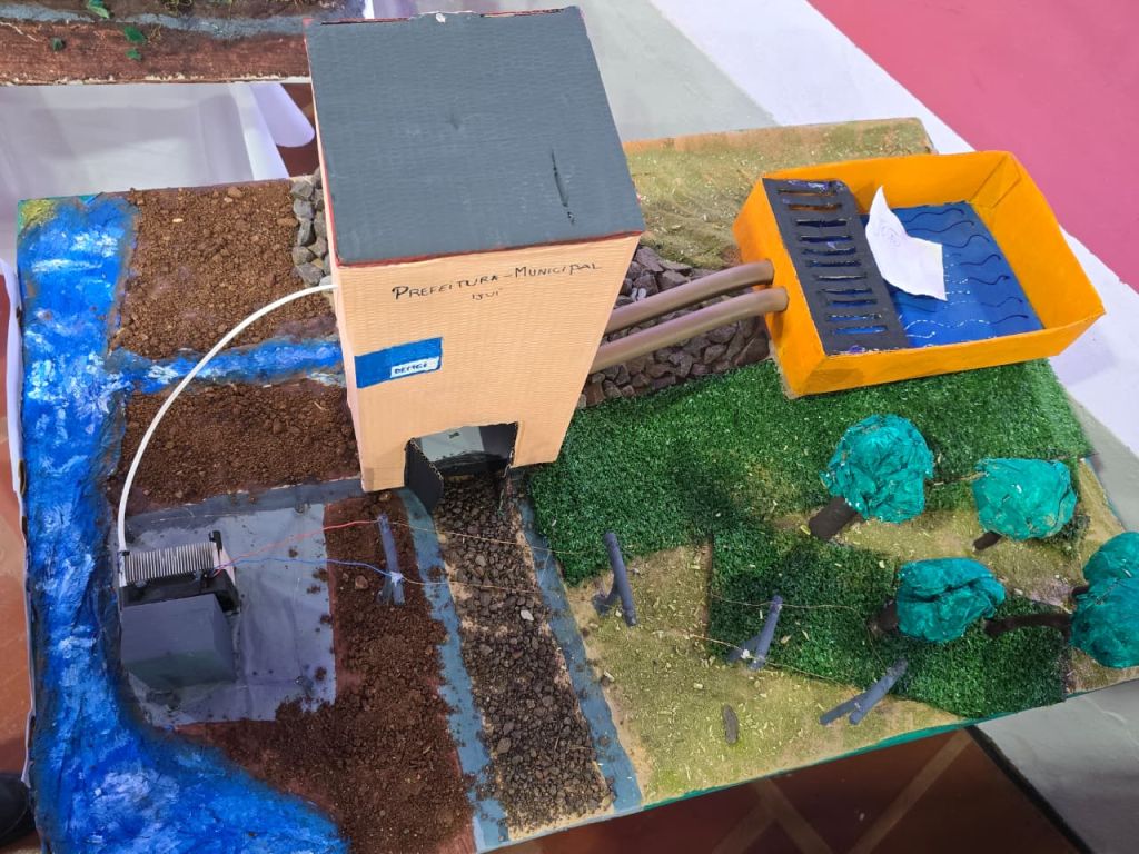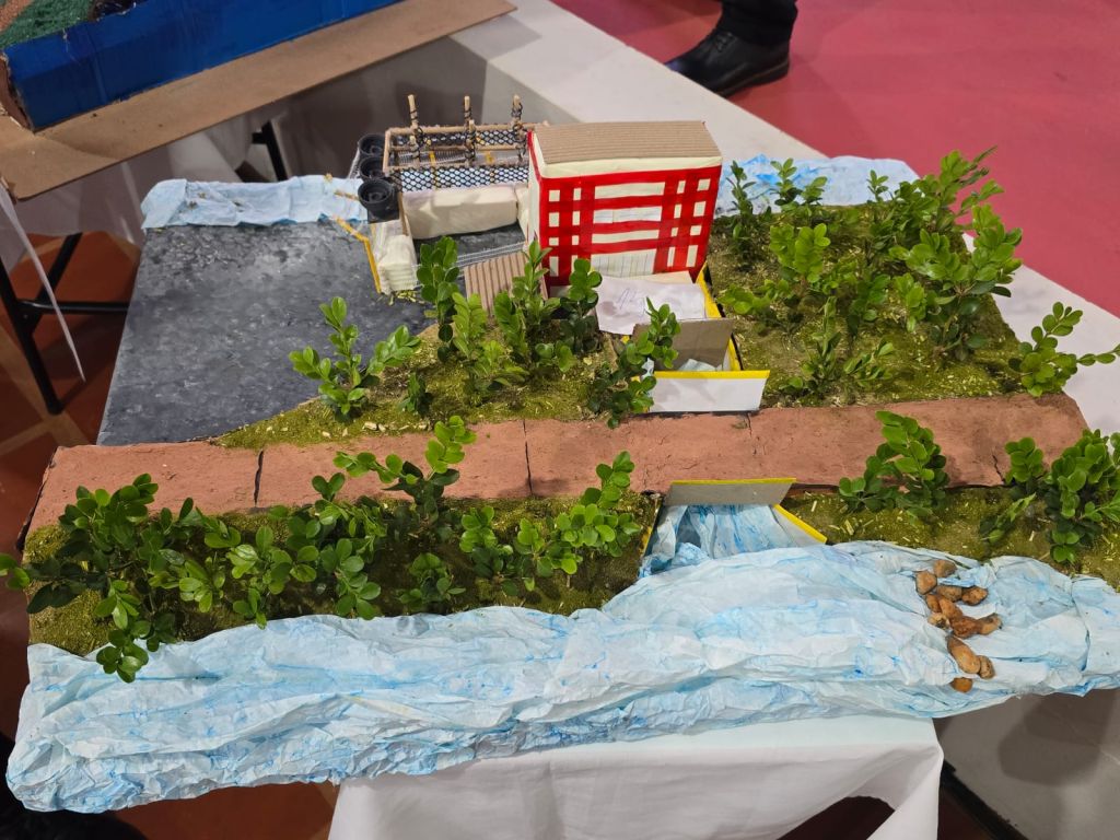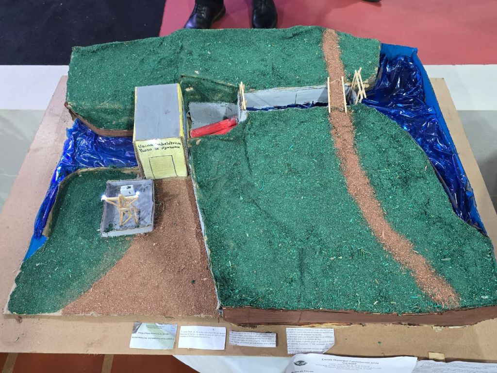 A maquete representa uma réplica da Usina Passo de Ajuricaba, com foco em demonstrar o funcionamento de uma usina hidrelétrica. Criada a partir de materiais reciclados, apresenta o corpo da barragem, as tubulações, a casa de força, a vegetação e as margens do rio. O modelo busca tornar visível o papel da engenharia, da natureza e da tecnologia na produção de energia limpa e renovável, promovendo a compreensão dos princípios físicos envolvidos e dos impactos ambientais e sociais dessa fonte energética. Mais do que uma representação, a maquete é um convite para imaginar a água em movimento se tornando eletricidade.