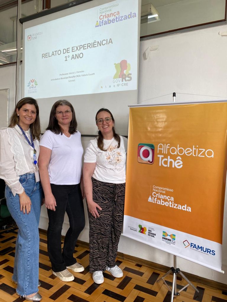 Estiveram presentes no evento, a assessora pedagógica da SMED Rafaela Gusatti Schimidt, a professora do 1º ano do IMEAB, Jéssica Leindecker Dorneles, que apresentou o projeto “Entre letras e palavras”, e a professora Francieli Andreatta Brudna, que atua nas redes municipal e estadual e também é formadora municipal do programa. Ela apresentou o trabalho “Sequência de jogos e desafios”, voltado à formação continuada de professores.