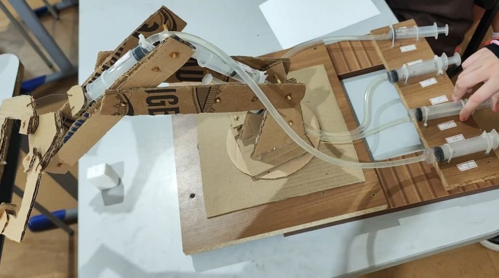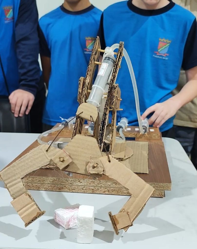 Como proposta prática, um grupo de cinco alunos construiu uma garra hidráulica utilizando materiais como papelão, cola quente, palitos, seringas e base de madeira. A produção foi realizada tanto em sala de aula quanto em casa, integrando diferentes momentos de aprendizagem.