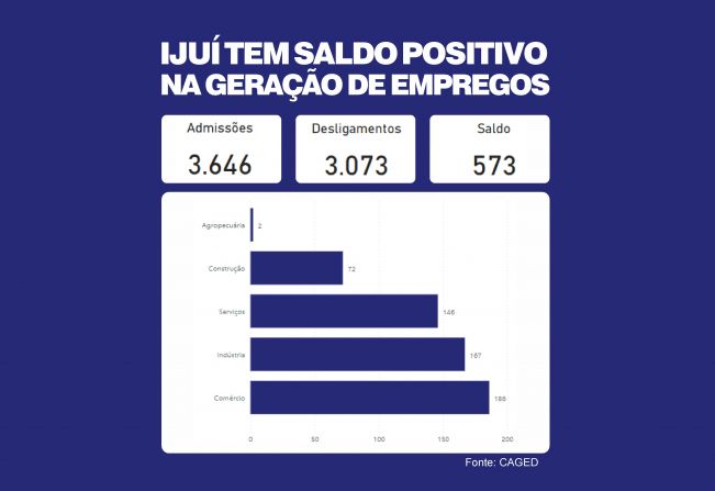Segundo informações oficiais do CAGED - Cadastro Geral de Empregados e Desempregados, Ijuí apresenta saldo positivo com relação às contratações de funcionários. No mesmo período do ano passado a cidade registrou 2.937 admissões e 3.068 desligamentos, obtendo um saldo negativo de 131 vagas. Nesse ano, são 3.646 admissões e 3.073 desligamentos, resultando num saldo positivo de 573 novos postos. “Embora estejamos passando por um período delicado, com relação a pandemia, a economia se alicerça em setores como da agricultura e construção civil para a retomada”, comenta Luiz Schirmann, secretário de Desenvolvimento Econômico, que salienta sobre o grande número de vagas para quem deseja trabalhar. Schirmann credita à coragem dos empresários os números positivos.
