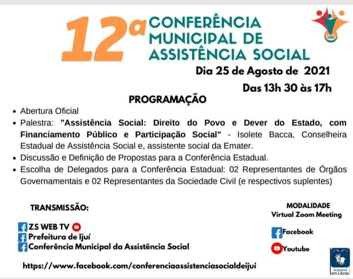 Amanhã ocorre em Ijuí a 12º Conferência Municipal de Assistência Social. Pela questão da pandemia, o evento irá ocorrer de forma online e inicia com a palestra “Assistência Social: direito do povo e dever do Estado, com financiando publico e participação social”, ministrado por Isolete Bacca, conselheira estadual de assistência social e, assistente social da Emater. O evento será transmitido pelo facebook da ZS WEB TV e da Prefeitura de Ijuí.