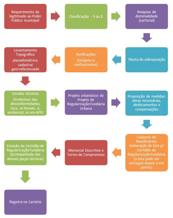 Abaixo apresentamos um Fluxograma dos processos de REURB, que demonstra as diversas fases que todos os processos devem atender, sendo que cada uma delas tem uma série de desdobramentos que podem ser necessários ou não. Assim, não há como estabelecer um prazo específico de duração do processo, visto que são múltiplas variáveis que influenciam no andamento do processo.