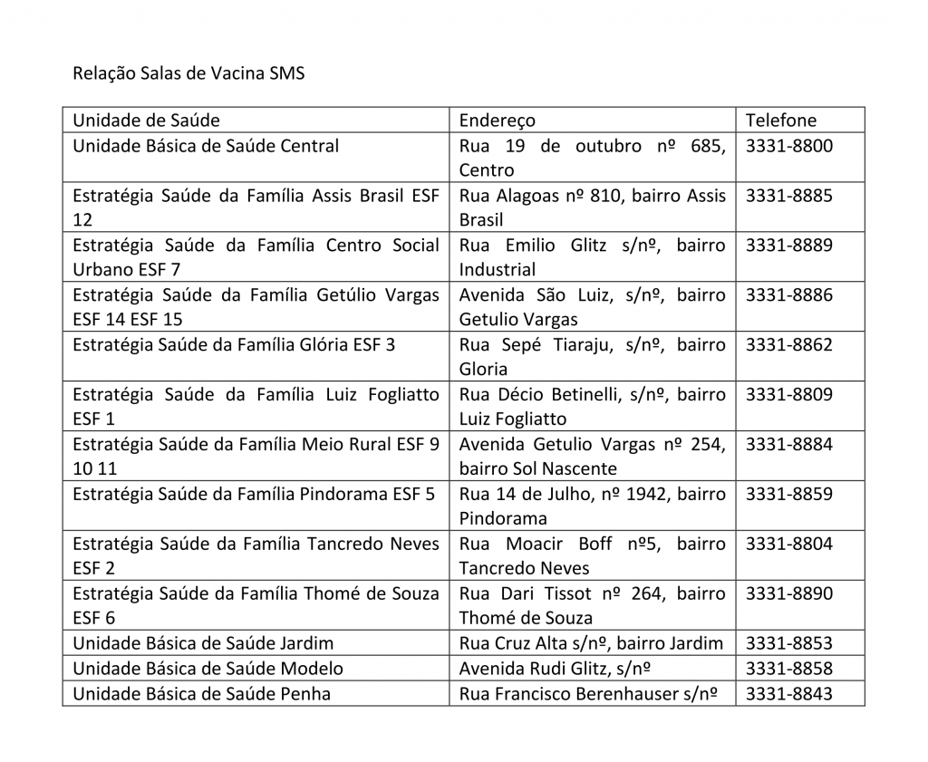 Com o recebimento de nova remessa de doses, Ijuí inicia neste sábado a vacinação para a população idosa de 81 anos completos a 84 anos, dia 27/02/2021, das 08:30 às 12:00 todos os Postos de Saúde que possuem Sala de Vacinas de Ijuí estarão abertos para dar início a imunização contra a covid-19 deste público. Os idosos deverão comparecer com documento de identificação e comprovante de residência. Para os idosos com dificuldade de locomoção, as equipes de saúde irão vacinar nos carros. Para idosos acamados, os familiares poderão contatar por telefone sua Unidade de Saúde de Referência para posterior agendamento de vacinação em domicílio. Também, segue a vacinação para idosos acima de 85 anos. Dúvidas, podem ser esclarecidas pelo telefone 3331 8800 - solicitar Central Covid 19 ou por contato telefônico na sua Unidade de Saúde de referência.
