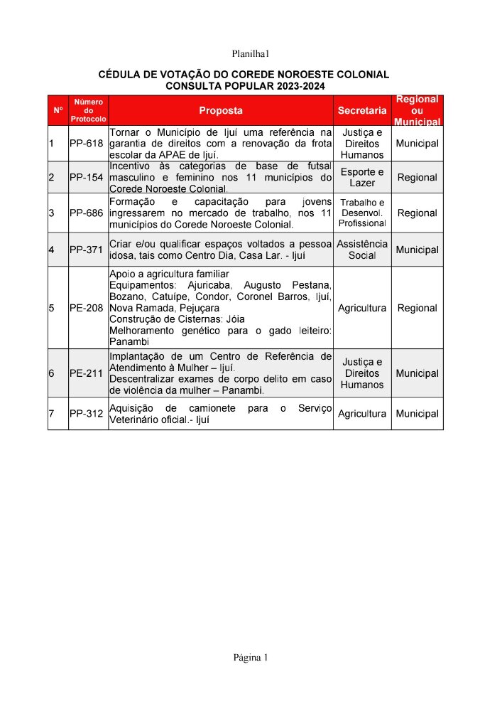 A votação da Consulta Popular inicia no próximo dia 27 e segue até dia 1º de dezembro. A votação ocorrerá de forma online e no município será disponibilizado em todas as 26 escolas da Rede Municipal de Ensino, um computador para os cidadãos ijuienses realizarem a votação.